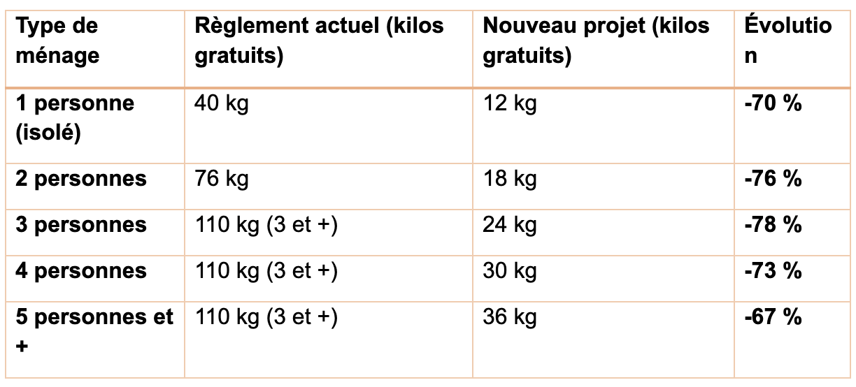 Le nouveau règlement communal a aussi un impact sur les kilos gratuits puisque les quotas sont revus à la baisse. Comme on peut le voir sur ce tableau présenté par la majorité :
